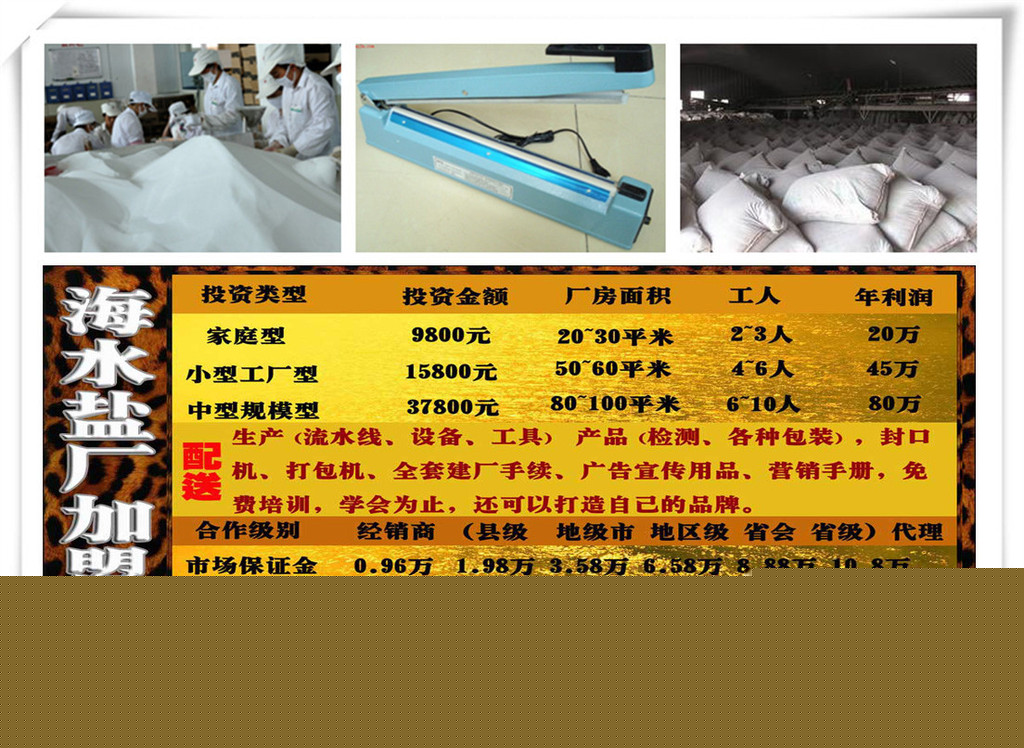 我们是天津最大的海水盐(晶,素,精)加工工厂,招商办厂家庭型,小型工厂,办厂投资9800元,产房20平方米,工人2~3人,生产配送工具,产品各种彩色包装,配送封口机,打包机,全套建厂手续,广告宣传用品,营销手册,免费培训,学会为止,还可以打造自己的品牌。韩经理13207694220招商热线(海水晶盐900/吨 5400/吨符合国标)
