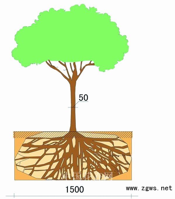 一般而言,大树树冠和地下根系的伸展空间基本相当,甚至根系范围超越地上树冠范围。这样才能“根深叶茂”(如图1)。但很多人在移栽大树的时候却完全忽略了这些知识,以为只要有个树坑通过截干修枝就能养活一株大树(如图2)。